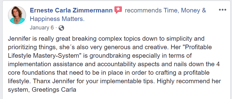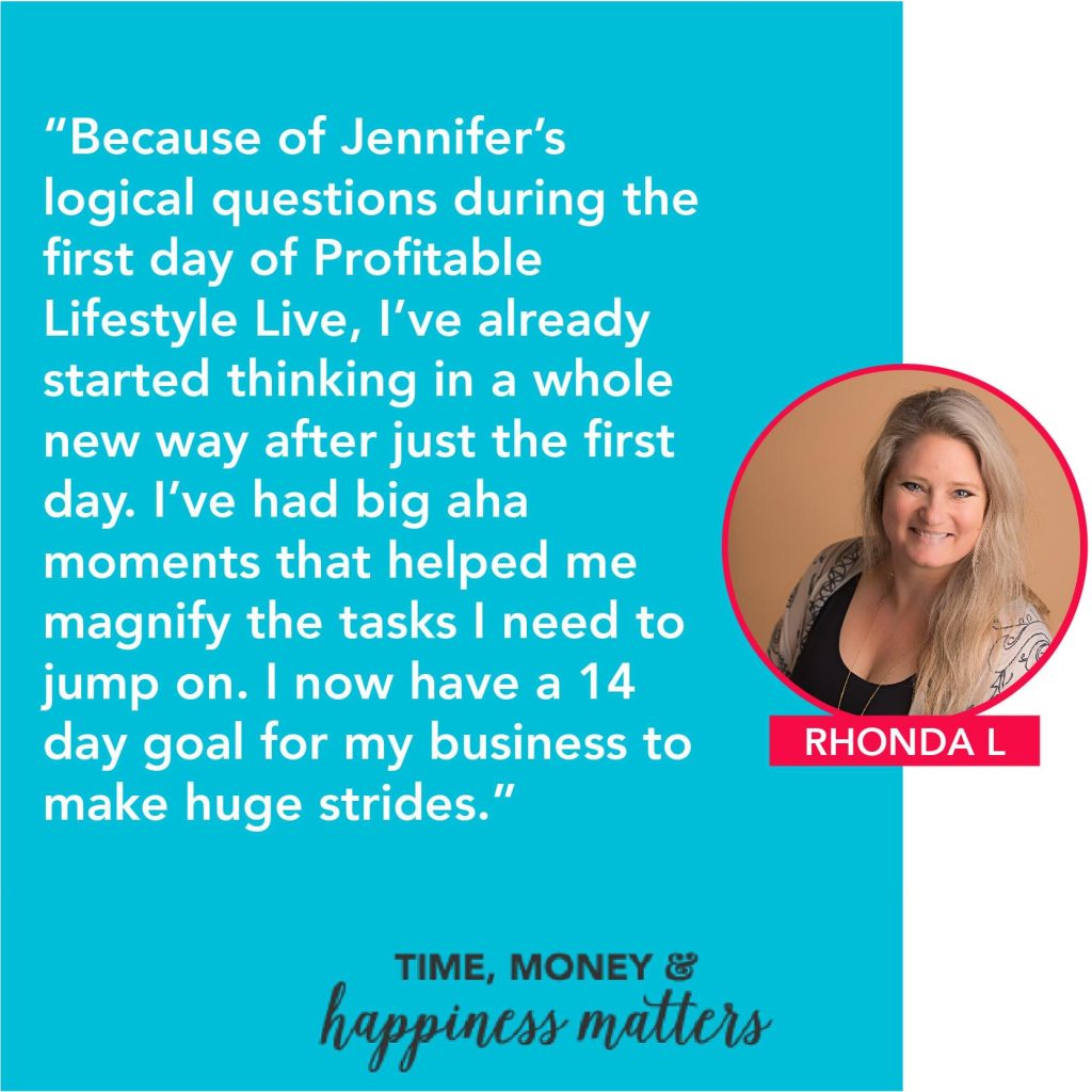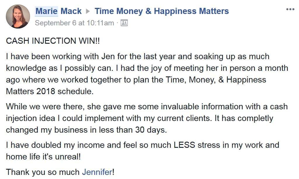 This July she gave me some invaluable information with a single cash injection idea I could implement with my current clients. It has completely changed my business in less than 30 days. I have doubled my income and feel so much LESS stress in my work and home life - it's unreal! Thank you so much Jen!"