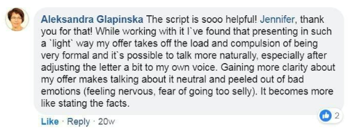 "The template is absolutely brilliant! Thanks to it and the previous exercises I was able to construct my message more clearly, authentically and intuitively. Thank you so much, Jennifer! I contracted 5 people and received 4 replays. I have 2 telephone conversations and arranged 2 face-to-face appointments. After two phone calls I have one prospect who is willing to work with me on long term basis and one client who starts a 3 month program in 2 days"